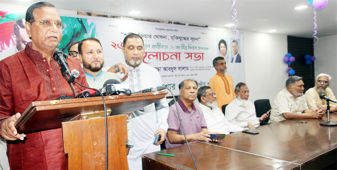DSCC Administrator freedom fighter Abdus Salam speaks at a discussion on the topic of Shaheed Zia's declaration at the beginning of the Liberation War on the occasion of Independence and National Day held at the National Press Club in Dhaka on Saturday.