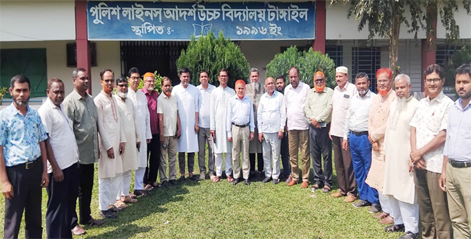 MIRZAPUR (TANGAIL): The president, general secretary, and other members of the Bangladesh Secondary Teachers’ Association poses for photo session after a discussion meeting held at Police Lines Adarsha High School in Tangail on Saturday, marking the inauguration of the Tangail district branch.