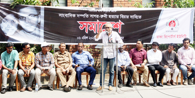 Journalists hold a protest rally at Dhaka Reporters Unity in the capital on Monday, demanding justice for the murder of journalist couple Sagar-Runi.