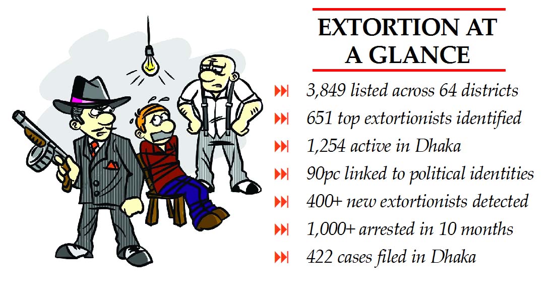 According to law enforcement data, a preliminary list of 3,849 extortionists has been prepared, including 1,254 in Dhaka Metropolitan Police (DMP) areas and 2,595 in other districts.