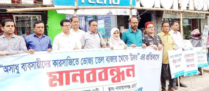 NARAYANGANJ: The Consumers Association of Bangladesh (CAB) forms a human chain in front of the Narayanganj Press Club on Wednesday protesting artificial shortages and overpricing of edible oil, demanding strict price enforcement, action against syndicates, and use of food-grade containers.