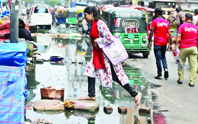 A commuter crosses a waterlogged road by stepping on bricks, as poor drainage causes even light rainfall to flood the streets. This photo was taken from Elephant Road in the capital on Wednesday.