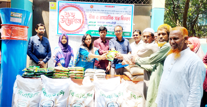 CHATMOHAR (PABNA): Upazila Agriculture Officer Kuntala Ghosh distributes free jute, Aus paddy, moong, and sesame seeds to 3,200 small and marginal farmers under the agricultural incentive programme in Chatmohar upazila of Pabna on Wednesday.