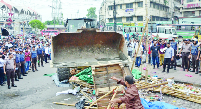 Mobile court of DSCC conducts a sidewalk clearance drive on both sides of GPO Link Road on the south side of Baitul Mukarram Market in the capital on Thursday to reduce traffic congestion.