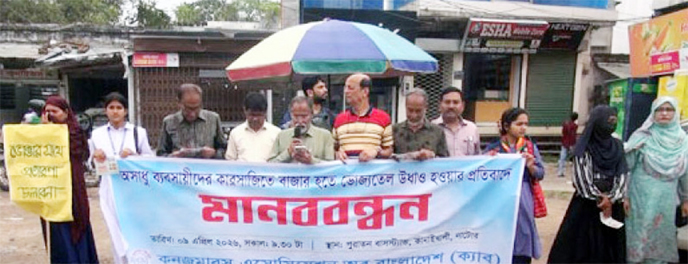 NATORE: Citizens and leaders of the Consumers Association of Bangladesh (CAB) forms a human chain to protest the artificial shortage of edible oil caused by dishonest traders, demanding immediate supply normalization and strict action in the Kanaikhali area of Natore on Thursday.