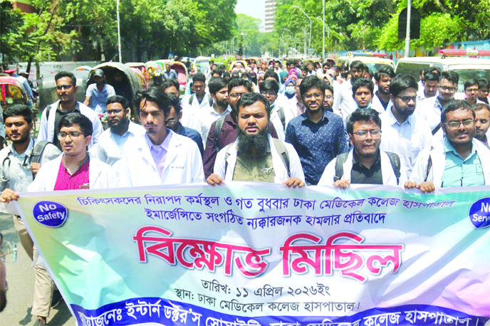 The Intern Doctors' Society of Dhaka Medical College Hospital holds a protest procession on Saturday, demanding safe workplace for doctors and condemns the attack on hospital's