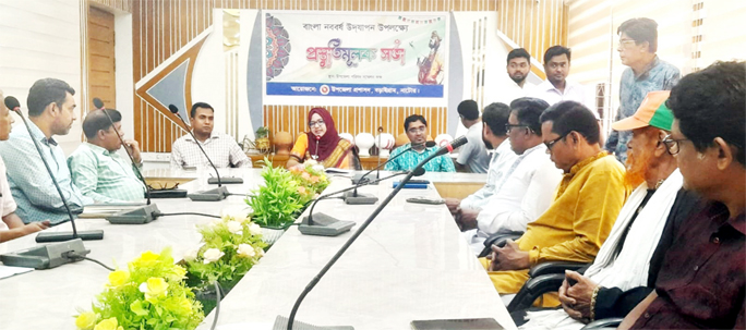 BARAIGRAMN (NATORE): Upazila Nirbahi Officer Laila Jannatul Ferdous speaks at a preparatory meeting held in Baraigram Upazila of Natore on Thursday, to ensure successful celebration of Bengali New Year 1433. Assistant Commissioner (Land) Md. Zubair Jahangir and other senior officials were present at the meeting.