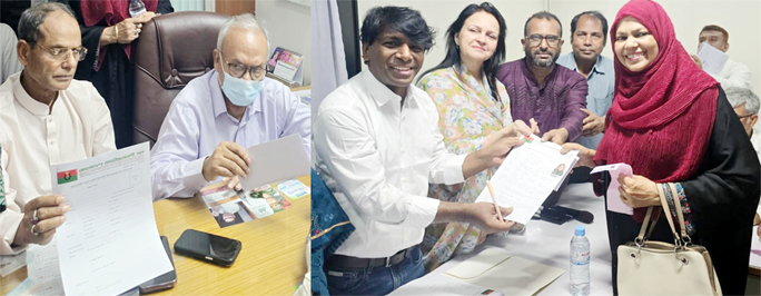 MIRZAPUR (TANGAIL): Khandakar Afroza Nipu, former general secretary of Dhaka University's Kuwait Maitree Hall Chhatra Dal, submits her nomination for a reserved women's parliamentary seat at the BNP central office in Tangail on Saturday in the presence of Advocate Ruhul Kabir Rizvi, adviser to Prime Minister Tarique Rahman.