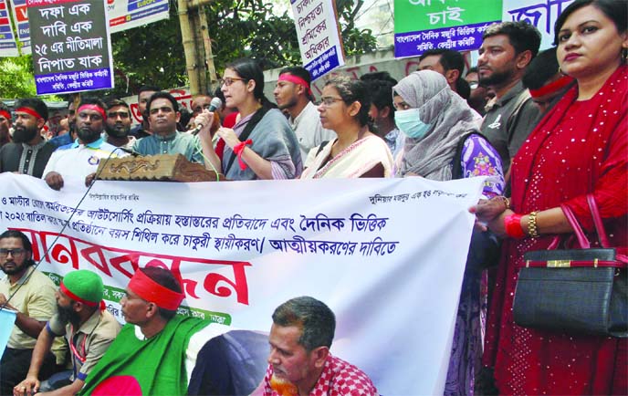 Daily Wage Employees' Association forms a human chain in front of the National Press Club on Saturday, protesting the outsourcing process and demanding regularisation in their respective institutions with relaxed age limits.