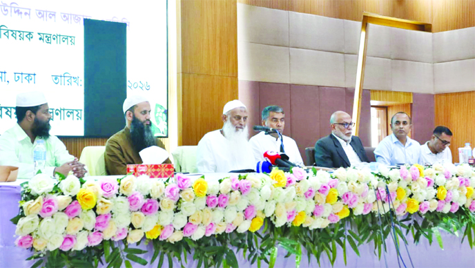 Religious Affairs Minister Kazi Shah Mofazzal Hossain addresses at a training programme for Hajj team members at the Hajj Office conference room in Ashkona in the capital on Wednesday.