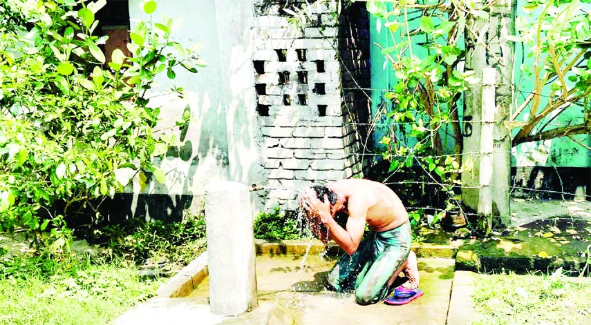 ISHWARDI: A worker seen cooling himself at a roadside municipal water tap, drenching his head and body to get relieve from the intense discomfort caused by the oppressive heat. The photo was taken in front of Matri Mandir in the Karmakarpara area near the market on Tuesday.