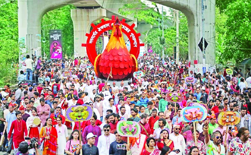The Baishakhi Shobhajatra, one of the most anticipated highlights of the celebrations, carried the theme “Harmony of the New Year, Revival of Democracy”, reflected through masks, motifs and symbolic installations.