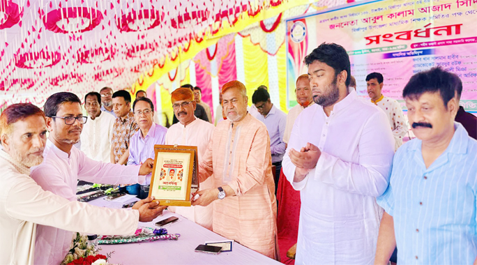 MIRZAPUR (TANGAIL): Abul Kalam Azad Siddiqui, MP receives a crest at a programme held at the Shaheed Bhawani Prasad Saha Government College in Mirzapur upazila of Tangail on Friday organised by the Upazila Secondary Teachers' Association,