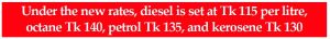 Under the revised pricing structure, diesel will be sold at Tk 115 per litre, octane at Tk 140, petrol at Tk 135, and kerosene at Tk 130.