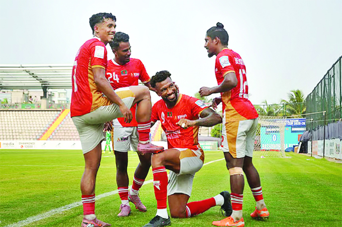Players of Bashundhara Kings celebrate after scoring a goal against Bangladesh Police Football Club during their Federation Cup Football match at Bashundhara Kings Arena on Tuesday.