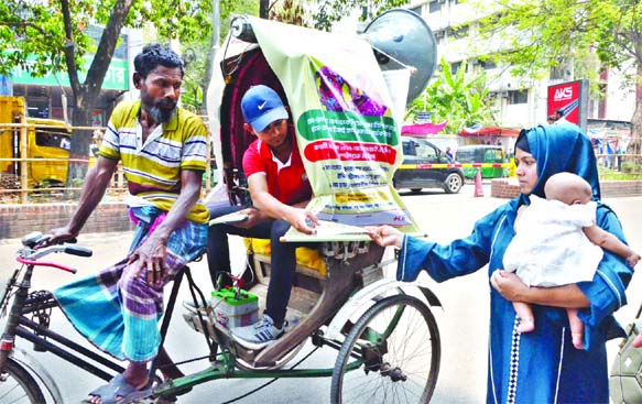 As measles infections rise across the country, awareness messages are broadcast to city residentsby loudspeaker on rickshaws. The photo is taken in the capital’s Jigatola area.