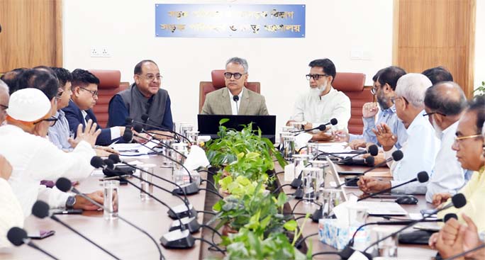 Road Transport and Bridges Minister Rabiul Alam chairs a review meeting on transport fares in light of the rise in fuel prices at the ministry on Thursday.