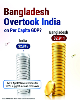 The Scroll cited IMF data showing that while Bangladesh is projected to edge ahead in 2026, India had already moved slightly in front in 2025, with per capita income of $2,675 against Bangladesh’s $2,635.