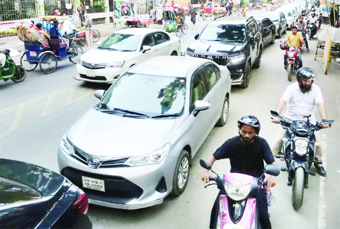 Fuel stations have been experiencing long queues over the past several weeks, though the line was significantly shorter. The photo was taken from in front of the city’s Matsya Bhaban on Saturday.
