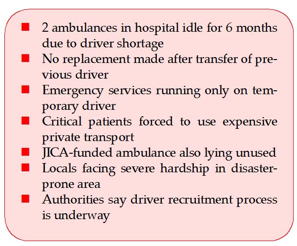Another ambulance provided to the hospital with funding from JICA is also lying unused. Due to the lack of a driver and a separate operational budget, the vehicle has remained idle in the garage for an extended period.