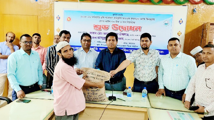 SINGRA (NATORE) : Upazila Nirbahi Officer Abdullah Al Rifat distributes agricultural inputs, including seeds and chemical fertilisers to 4,000 farmers in Singra Upazila of the district under the Aush Incentive Programme at the Upazila Agriculture Hall on Monday.