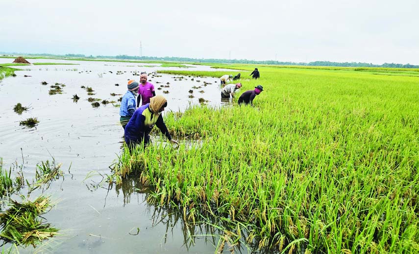 Farmers start harvesting their semi-ripe Boro paddy earlier, fearing that the remaining crops may get submerged as heavy rainfall and mountain streams from India have broken two dams in haor. The photo was taken from Sunamganj.