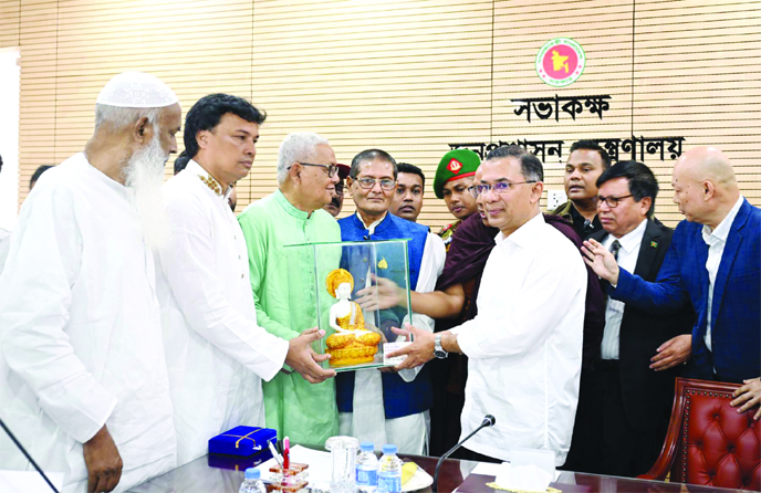 Leaders of the Buddhist community exchange greetings with Prime Minister Tarique Rahman on the occasion of Buddha Purnima at the Secretariat in the capital on Thursday.