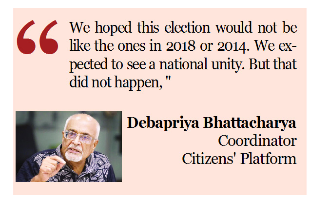 Staff Reporter : “Elections come and go. If they do not benefit the people, they are not useful,” Citizens’ Platform Coordinator Debapriya Bhattacharya said yesterday...