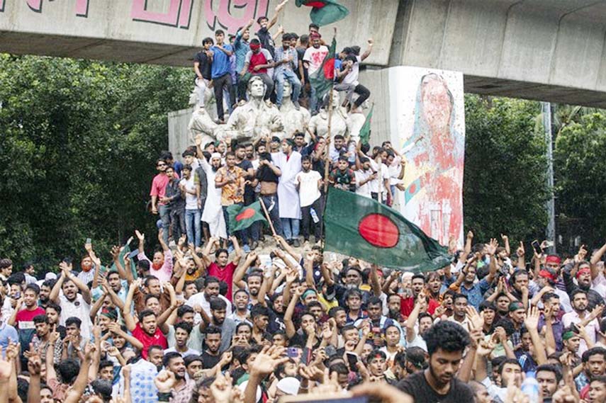 Bangladesh Unrest : Protesters climb a public monument to celebrate after receiving the news of Prime Minister Sheikh Hasina’s resignation in Dhaka, Bangladesh. Bangladesh has...