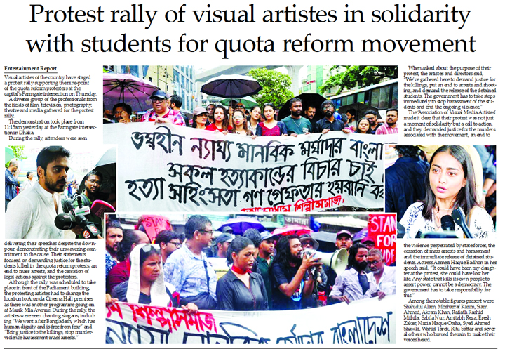 Entertainment Report :Visual artistes of the country have staged a protest rally supporting the nine-point of the quota reform protesters at the capital’s Farmgate intersection...
