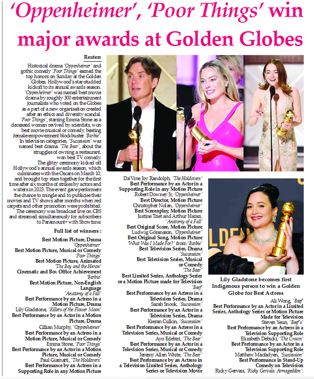 Reuters :Historical drama ‘Oppenheimer’ and gothic comedy ‘Poor Things’ earned the top honors on Sunday at the Golden Globes, Hollywood’s star-studded kickoff to its annual...