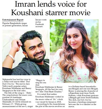 Entertainment Report :Popular Bangladeshi singer of present generation, Imran Mahmudul has lent his voice to a Tollywood movie titled ‘Daal Baati Churma.’ The movie stars...