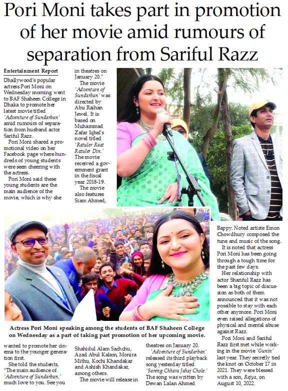 Entertainment Report :Dhallywood’s popular actress Pori Moni on Wednesday morning went to BAF Shaheen College in Dhaka to promote her latest movie titled ‘Adventure of...