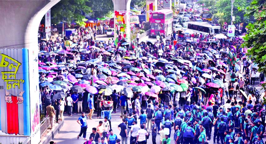 NN ONLINE: As part of the previously announced “Long March to Dhaka” initiative, engineering students from universities nationwide blocked the Shahbagh intersection in the capital...