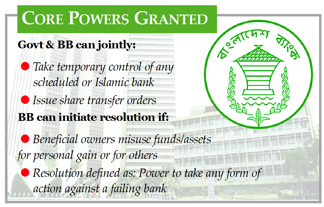 Staff Reporter : The government and the Bangladesh Bank (BB) have been granted broad authority to assume temporary control of any scheduled or Islamic bank...