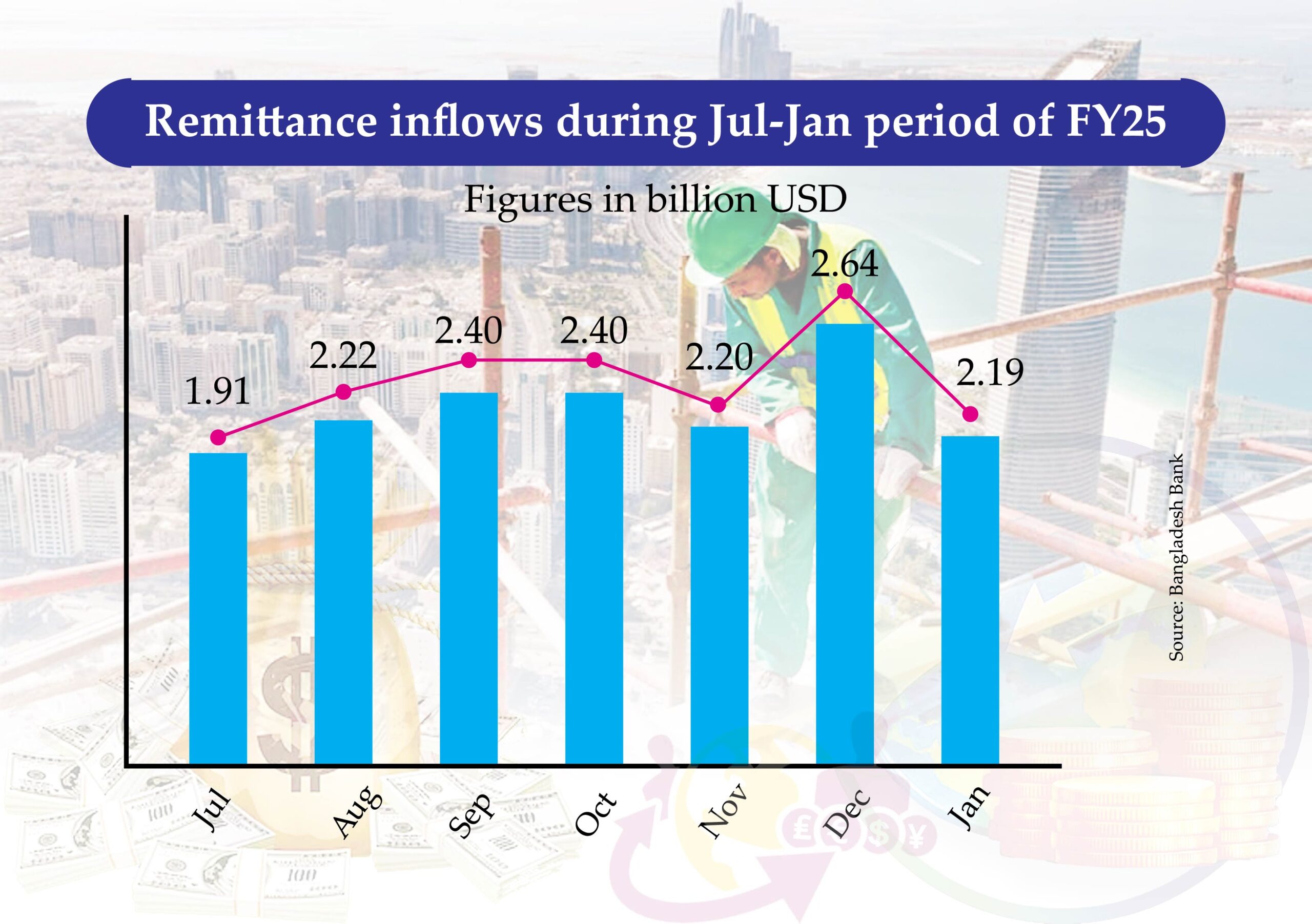 Muhid Hasan : Crosses $2b mark for six consecutive months Inflow during July-January period reaches 24pc YoY Bangladesh’s remittance earnings have surpassed the $2 billion...