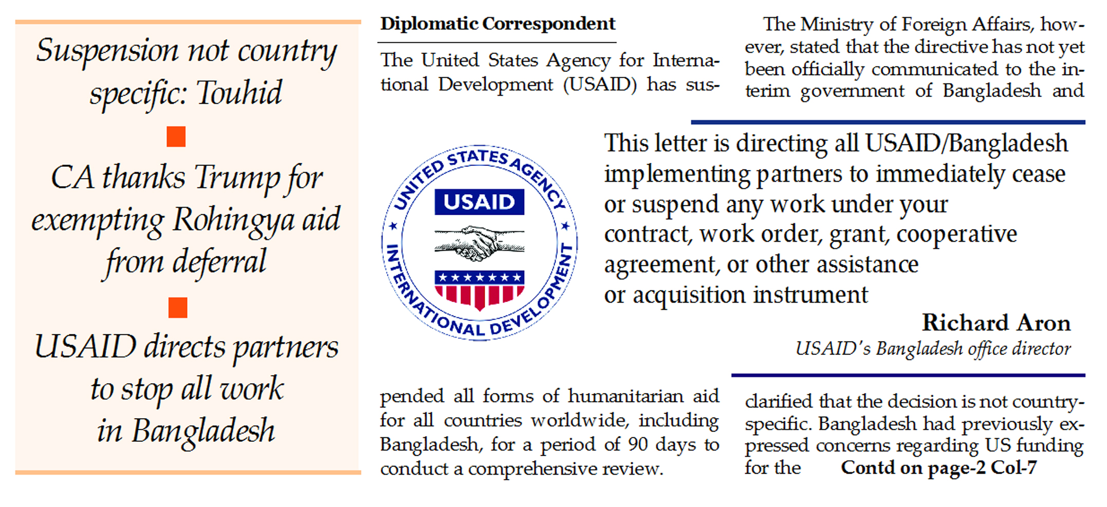 Diplomatic Correspondent : The United States Agency for International Development (USAID) has suspended all forms of humanitarian aid for all countries worldwide, including Bangladesh, for...