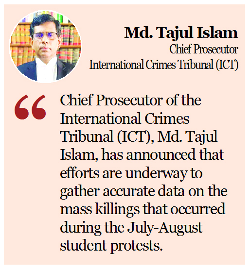 Staff Reporter : Chief Prosecutor of the International Crimes Tribunal (ICT), Md. Tajul Islam, has announced that efforts are underway to gather accurate data on...