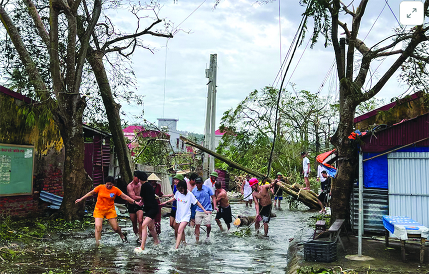 People use ropes to remove fallen trees following the impact of Typhoon Yagi, Hai Phong, Vietnam.