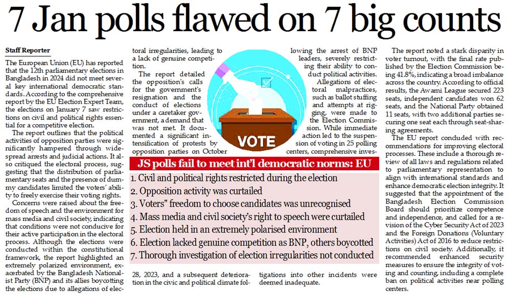 Staff Reporter : The European Union (EU) has reported that the 12th parliamentary elections in Bangladesh in 2024 did not meet several key international democratic...