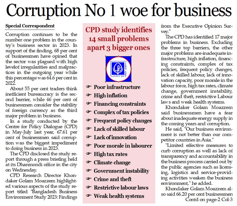 Special Correspondent :Corruption continues to be the number one problem in the country’s business sector in 2023. In support of the finding, 68 per cent...