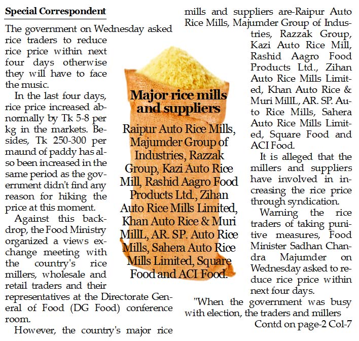 Special Correspondent :The government on Wednesday asked rice traders to reduce rice price within next four days otherwise they will have to face the music....