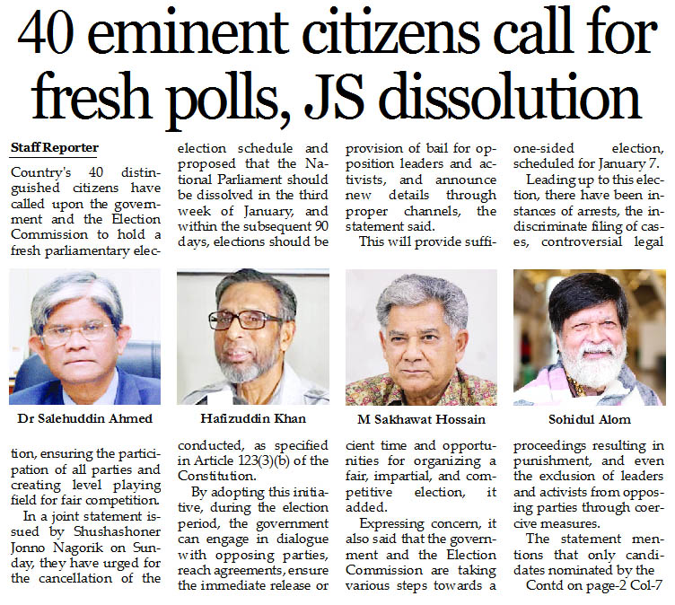 Staff Reporter : Country’s 40 distinguished citizens have called upon the government and the Election Commission to hold a fresh parliamentary election, ensuring the participation...