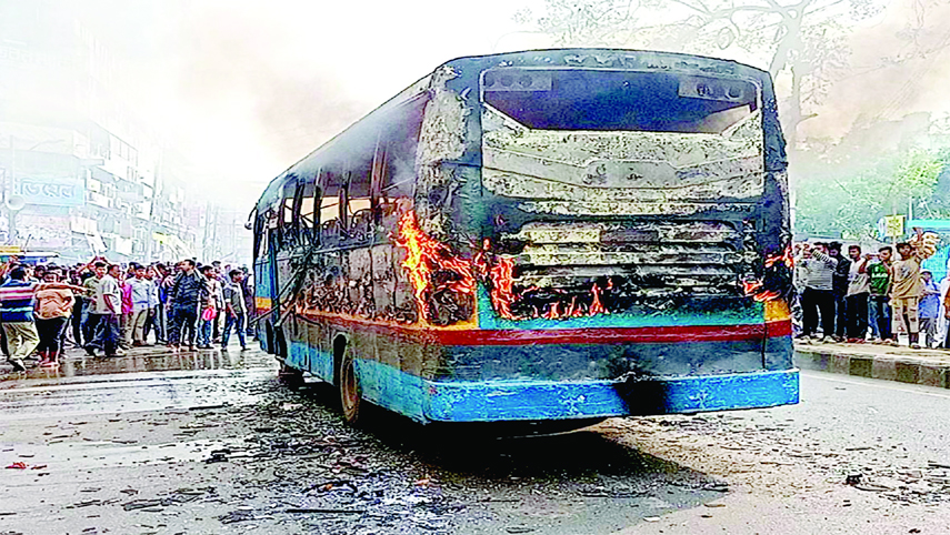 Staff Reporter :A passenger bus was set on fire by unidentified miscreants in city’s Gulistan area on Monday noon. A Tanjil Paribahan was set ablaze...