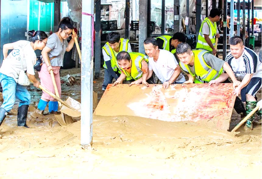 Residents clean up mud after a flood in Congjiang county, Qiandongnan Miao and Dong Autonomous Prefecture, Guizhou province. Floods in southwest China kill six and...