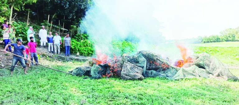 Mymensingh Correspondent : A mobile court in Gafargaon, Mymensingh, burned and destroyed 5,600 meters of banned current nets and China Duari nets.Executive Magistrate and Assistant...