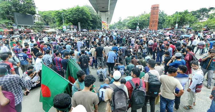 NN ONLINE: As part of the previously announced “Long March to Dhaka” initiative, engineering students from universities nationwide blocked the Shahbagh intersection in the capital...