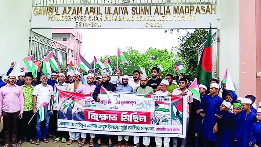 Staff Reporter : Teachers and students of Gausul Azam Abul Ulaiya Sunni Dakhil Madrasa held a protest march in Bariuri village area of Moulibazar, Sylhet...