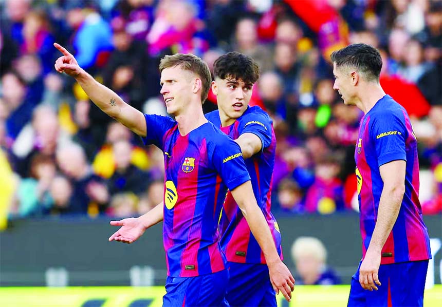 AFP, Barcelona : Champions Barcelona moved provisionally top of LaLiga on Saturday with a 3-1 win over Alaves, with midfielder Dani Olmo netting a brace....