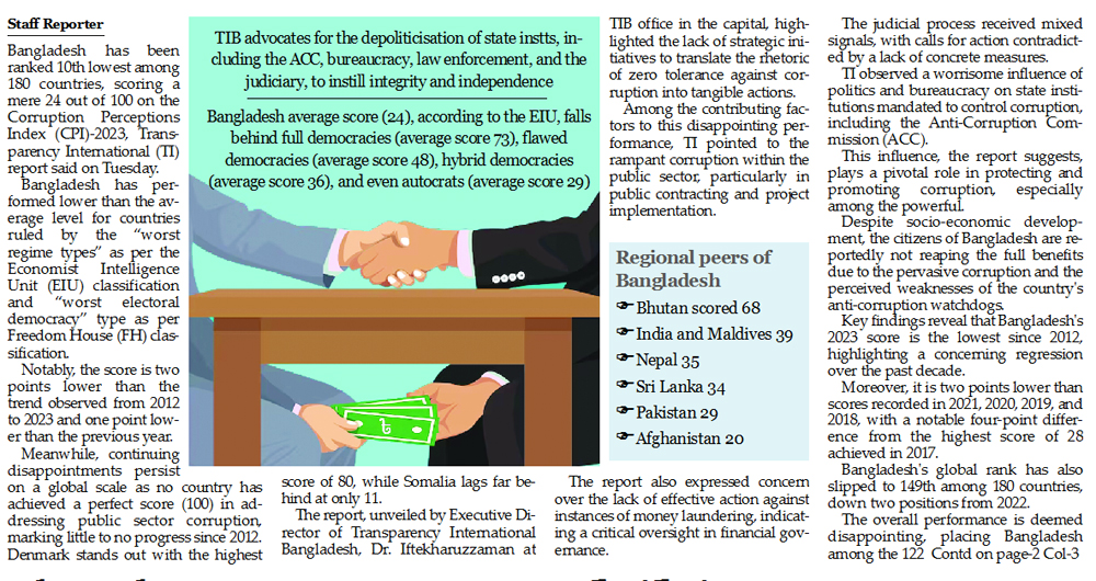 Staff Reporter : Bangladesh has been ranked 10th lowest among 180 countries, scoring a mere 24 out of 100 on the Corruption Perceptions Index (CPI)-2023,...